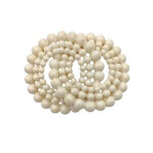 This vintage brooch showcases an intricate design of ivory-tone beads arranged in an elegant oval pattern. Its scalloped backing and secure pin clasp enhance its charm, making it a timeless accessory.