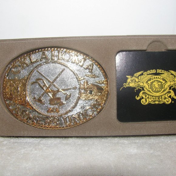 Oklahoma Farmers Union belt buckle made by Awards Design Metals in Norman, OK. This buckle is rare and very hard to find This solid Brass buckle measures 3 3/4 inches width, 2 3/4 inches in height. Will take a maximum of 1 3/4 inch belt. Still in original factory package, NOS The buckle is in excellent condition, package does show a little shelfware. I think this is from the 1980's..