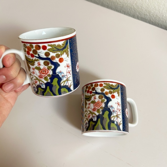 This is a set of two beautiful vintage Old Imari Japanese mugs. They are slightly smaller than typical coffee mugs and would be wonderful for coffee or tea or as decor for your collection. Please see measurements. One of the cups has dark spot inside, price reflects this flaw. Does not affect use. Pictured with a cherry coffee mug in a typical size for scale, cherry mug not included.