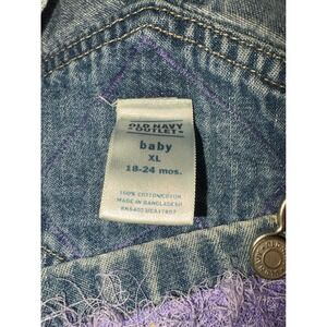 Keywords: baby overalls, denim overalls, girls overalls, patchwork overalls, ruffle overalls, Old Navy baby, baby clothing, XL baby, purple overalls, colorful overalls, playful overalls, baby fashion, kids clothing, denim pants