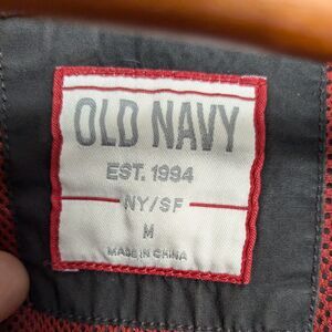 Y2K vintage hooded chore coat/utility jacket from Old Navy, size medium. Cotton shell. Zip and snap closure. Patch pockets. Fold away hood. Ideal for 90s, outdoorsy, gorpcore, heritage, and grunge vibes. Perfect for fall, winter, layering, travel, and every day.
