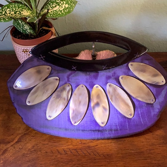Beautiful vintage old Shanghai purse. The color is more of an egg plant, but that did not translate in some of the photos. One corner of the handle of the purse needs to be stitched, but that is an easy fix well loved/used💗