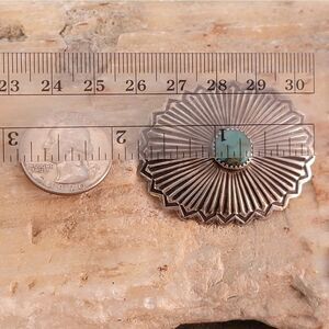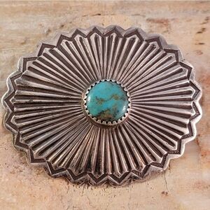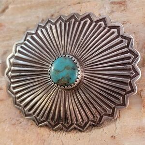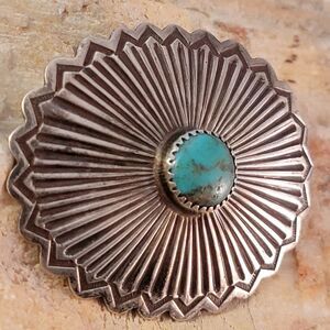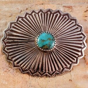 Stunning Old Pawn vintage sterling silver Navajo Cripple Creek mine turquoise sun symbol repousse stamped concho brooch pin. This is an amazing handcrafted piece. The piece has been tested and confirmed as sterling.