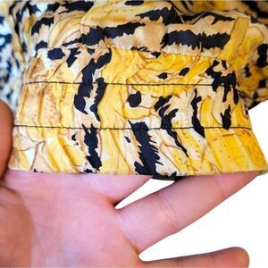 Size M. Has some spots around the bottom waistband and the cuffs where the silk has split, exposing the elastic. The elastic is still in tact and not crunchy. The rest of the jacket is in excellent condition. Has shoulder pads that could be removed if wanted. Awesome combination of Nautical and animal print.