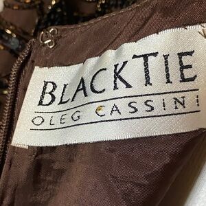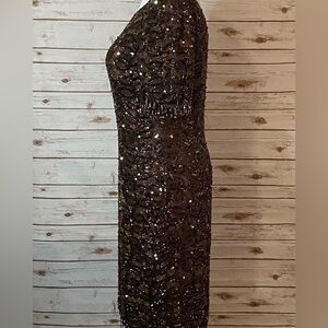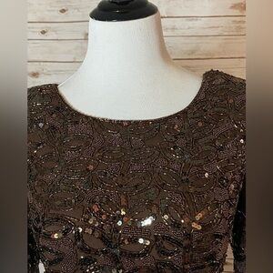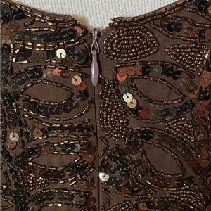 Bronze; crew neck; short sleeves; shoulder pads; embellished with sequins and beading; scalloped beading along edges of sleeves and hem; hidden back zipper; fully lined