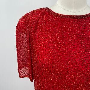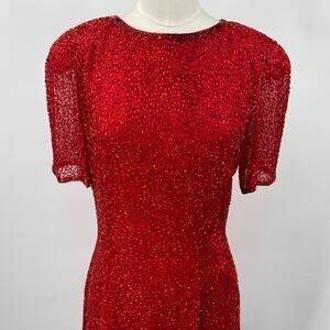 Keywords: vintage 80s nineteen eighties 1980s beaded cocktail dress silk glamorous glam cocktail party birthday special event red hot vintage glam aesthetic silky cherry red luxe fully beaded dress luxurious timeless maximalist extra artsy flirty evening holiday new years semiformal sophisticated glitzy opulent special occasion sparkly 1990s nineties 90s vtg retro art deco pinup coquette bold colorful