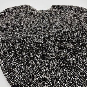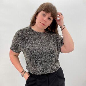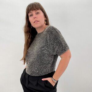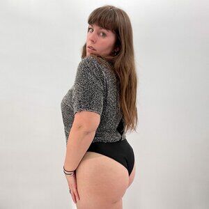 Details- This is a vintage Oleg Cassini Black Tie silk silver beaded blouse bodysuit. Buttons up the back. Snap crotch closure. Pair with your favorite high waist jeans and some heels!
