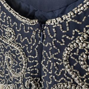 Medium navy color and beaded in clear(glass), cream and silver looking pearls beads