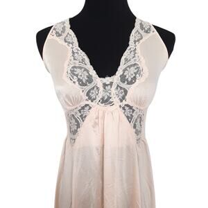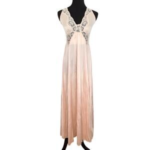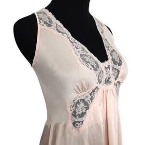 Vintage Olga 70s Full Sweep Gown Lingerie Satin Slip Dress Peach Lace Coquette