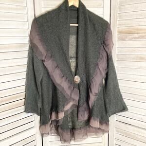 Vintage Olive 100% Wool Mohair? 100% Silk Trim Draped Shawl Neck Cardigan M/L