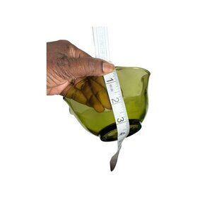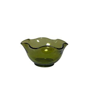 Add a touch of elegance to your home with this vintage olive green art glass bowl. Featuring a wavy ruffled edge, it serves as a stunning centerpiece, decorative candy dish, or catchall.