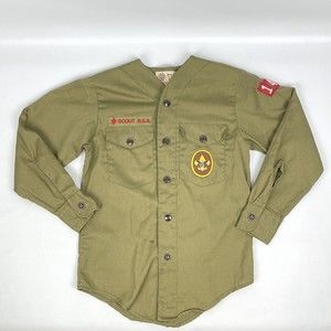 Vintage Olive Green BSA Boy Scout Uniform Shirt Long Sleeve 12 Neck Collarless Tenderfoot.