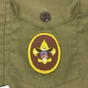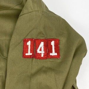 The shirt has the "SCOUT B.S.A" wording embroidered in red above the right front pocket. On the left front pocket there is the tenderfoot merit badge. The left sleeve has the troop number - 141. The top of the right sleeve has some residue presumably left over from a patch.