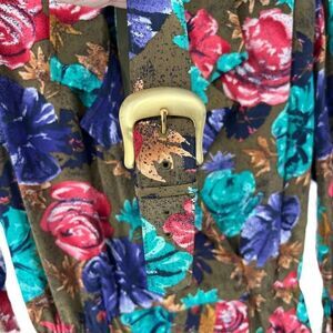 Vintage Olive Green Floral 100% Silk Faux Wrap Long Sleeve Dress with Belt