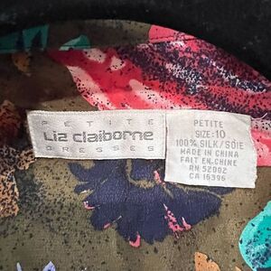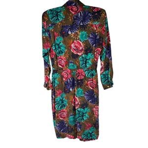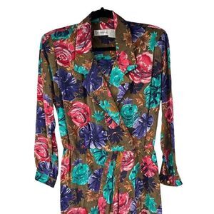 Vintage Floral 100% Silk Faux Wrap Long Sleeve Dress with belt but missing belt loops. Size vintage 10 Petite with measurements in the pictures. Gently used condition with no rips or stains.