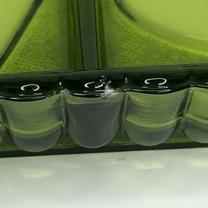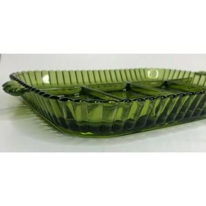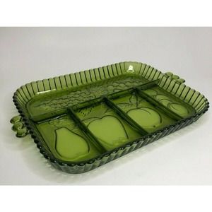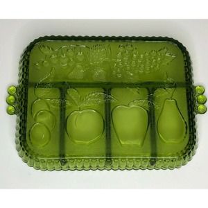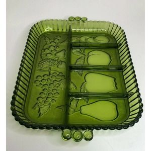 Vintage Olive Green Indiana Glass Divided Tray With Fruit Pattern Relish MidCent