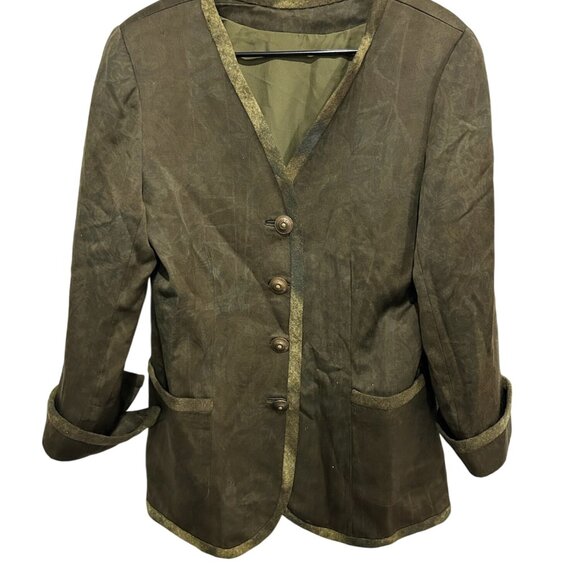 vintage jacket, olive green blazer, button-up blazer, casual jacket, rolled cuffs jacket, medium size jacket, cotton blazer, suede accents jacket, green outerwear, button front coat, women's lightweight jacket, classic women's jacket, vin