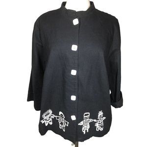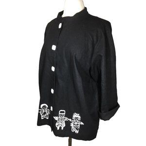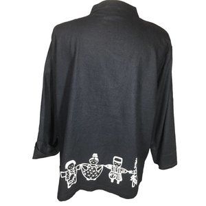 Vintage On The Rocks Women's 1X Black Cotton Linen Button Up Tribal Art to Wear