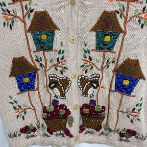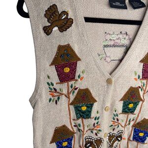 Vintage One Resource Beige Button-Up Sweater Vest Birdhouse Embroidered Sz S