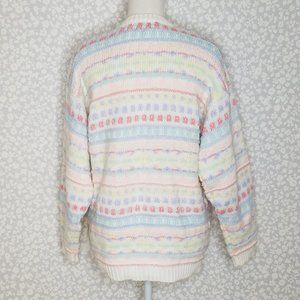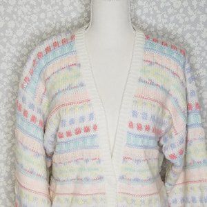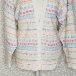 Beautiful vintage knit cardigan by One Step Up. White background with pink, blue, mint, yellow and yellow tulip fair isle pattern. Long sleeves. Button closure.