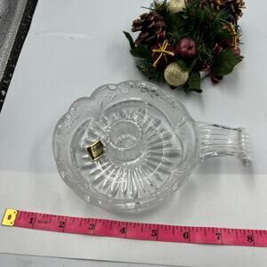 Vintage Oneida crystal candle stick holder and finger carrying holder, etched glass, comes with removable Christmas greenery ring.