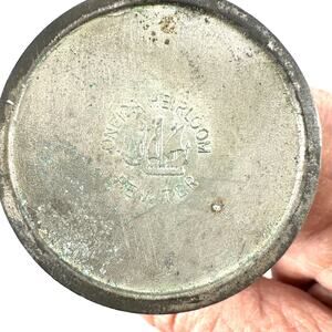 Pair of vintage Oneida Heirloom pewter salt and pepper shakers with side handles. Classic tall design, each measuring approximately 5" in height. Together they weigh 9.2 oz. Marked "Oneida Heirloom Pewter" on the base with the sailing ship hallmark. These shakers show natural patina and surface wear consistent with age, adding to their vintage charm. Perfect addition for pewter collectors, farmhouse kitchen décor, or rustic table settings.