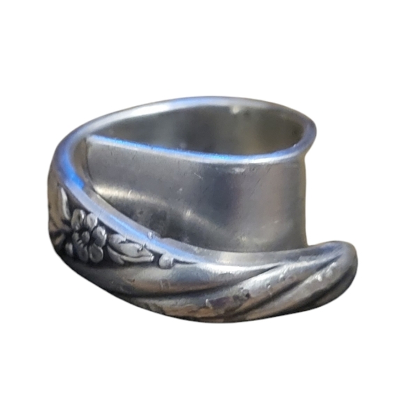 Made from a repurposed Oneida silver spoon, this ring carries both elegance and history, making it a unique piece for collectors and jewelry enthusiasts alike.