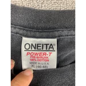 Vintage Oneita Power-T short sleeve tee in faded black with a small jack-o-lantern chest graphic. Classic crewneck, soft pre-shrunk cotton, USA-made tag—perfect fall/Halloween streetwear. The other sleeve stitch is broken please see the photo.