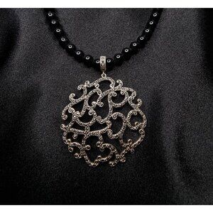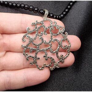 A striking late 1990s onyx and sterling silver 925 necklace, adorned with a lavish marcasite filigree pendant. This piece captures the elegance of vintage revival jewelry, blending timeless sophistication with gothic undertones that were celebrated in the decade’s romantic fashion trends.