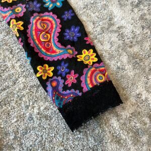 Vintage Oobee Doobee Black Paisley Floral Leggings. Baby toddler girl size 24 months. USA made. Such a fun print with colorful flowers and lace at the cuffs. Waist not as stretchy as it likely once was; no other flaws noted.