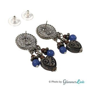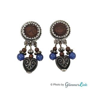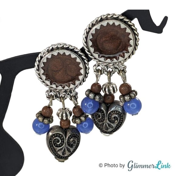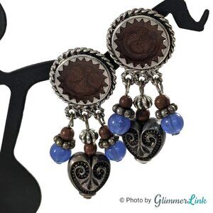 Vintage bohemian silver tone dangle earrings featuring a round stud enameled in brown, and three dangling strands accented with beads and a heart. The beads in the strands are brown, silver tone and blue. The silver tone heart features an ornate etched design.