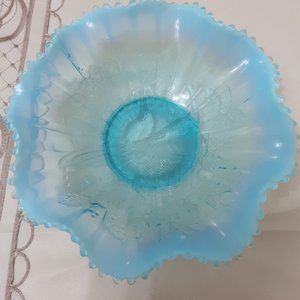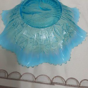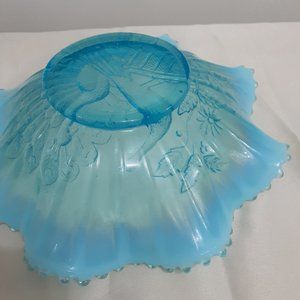Beautiful blue Vintage Jefferson opalescent glass ruffled edge dish for candy, display or dessert. Peacocks on the Fence Design. Approx 9"x3". Excellent gently used condition with no cracks or chips.