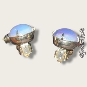 The **opalescent glass or moonstone-like glass**is known for its iridescent quality, similar to natural opal. This has a purple hue. It was popular in the mid-20th century in costume jewelry, particularly around the 1950s and 1960s.
