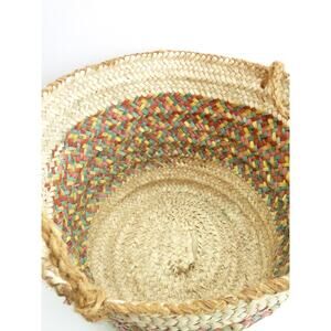 This listing is for a vintage woven open basket. Size is about 11" tall x 14" at widest. Nice basket for storing rolled up towels or sofa blankets. Some wear on jute handles and some fade on dyed parts. Will be packed with care.