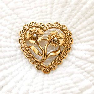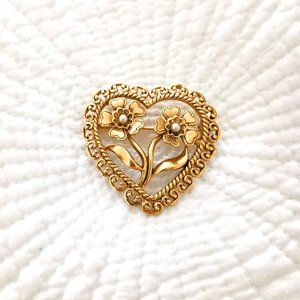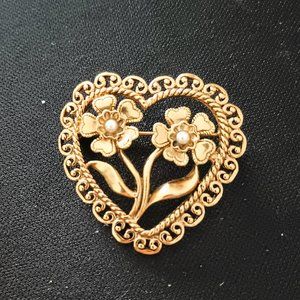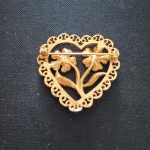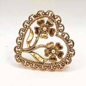 Vintage Open Heart Brooch Gold Tone with Faux Pearls and Two Flowers