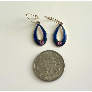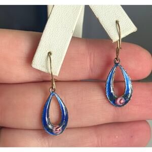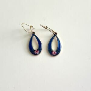 Vintage Open Hoop Blue And Pink Enamel Cloisonne Dangle Earrings Gold Tone