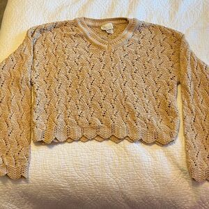 knit, cropped, crop, v neck, long sleeve, open knit, fairy, cottage, cottagecore, 90s, 80s, vintage, retro, classic, scallop, cozy, comfy, relaxed, lounge, school, campus, college, academia, feminine, soft, cotton, natural fiber, tan, brown, beige, neutral, 90s mom core, earth tone, cable knit, ribbed