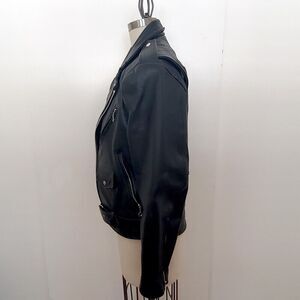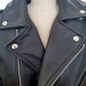Vintage from the 1990s, this Open Road Moto Jacket is in great condition. Removable Thinsulate lining makes it suitable for winter as well as shoulder seasons. Classic motocycle style with full diagonal zip, waist belt, zippered and button pockets, in a heavy black leather. The jacket is quite heavy and sturdy with padded shoulders. Womens Size M, 36