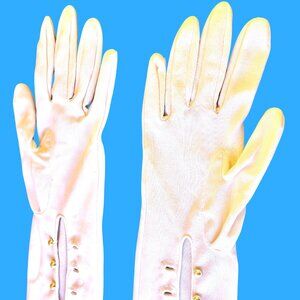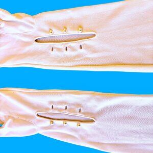 Vintage stretch white long opera length gloves. Three buttons and button holes.
