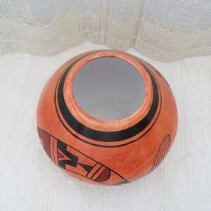 This vintage pot is a gorgeous orange with a Hopi style design in black and red. It has been in storage since 2003, when my gift shop closed. It was purchased by me from a wholesale dealer in Texas. It has never been used. There are 2 small scuff marks as shown in the photos. The inside of the pot is white. There is no signature on the bottom of the pot, but there is a Made in Mexico sticker.