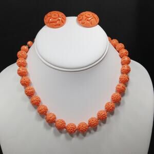 Vintage Orange Molded Beads Necklace & Earrings, Lucite, 1950s