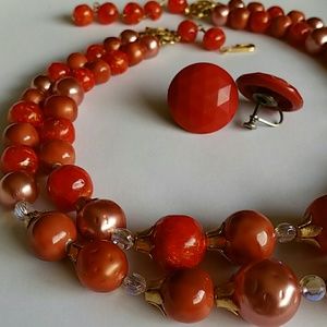 This is a great vintage set. Necklace has a hook closure and double stranded. The oranges are on the rosier side. Great mix of strong and muted colors. Features small clear beds and gold accents. Made of resin. The earrings are 1" in diameter. Necklace is 15" and 18" with and added adjustment of 2.5"