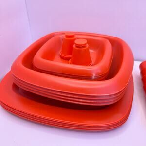 Mid Century Vintage Nested PICNIC Set for 4 with Handle ORANGE Plastic Retro