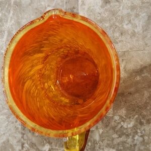 Add a touch of elegance to your home with this handcrafted orange glass pitcher. Perfect for serving beverages or as a decorative piece. Yellow and Orange with white spots. Vintage.