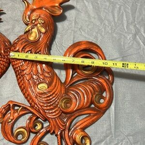 Pair of vintage rooster wall decor in vibrant orange and gold. Perfect for adding a rustic touch to any room.