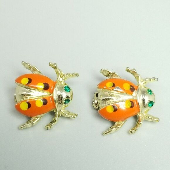 Vintage Orange Enamel Bug Scatter Pins, Retro Brooch Set, Green Eyes, Estate
