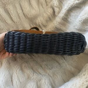 Vintage Orbach’s black leather basket bag with brass hardware. Overall, this bag is in very good vintage condition, but please see photos for spots where the black has worn off. It can easily be touched up. It looks a lot like the Miu Miu basket bag at a fraction of the price.