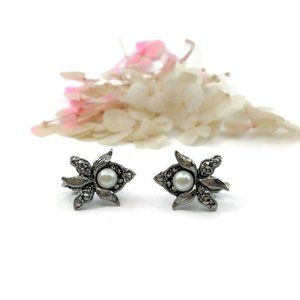 Lovely pair of vintage faux pearl and marcasite orchid clip-on earrings in silver-tone metal. These are a flower, possibly an orchid with the pearl towards the top.