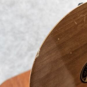 Item does have a little chip, a scratch and what skates to be a paint stain. Chip cab halt be seen from the from/side-- it is now so on the backside/edge.