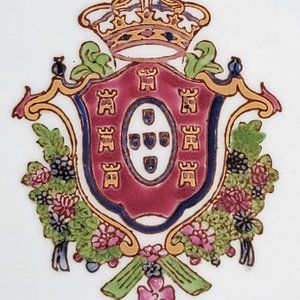 Blue and white Asian Delft style with multi-colored crest